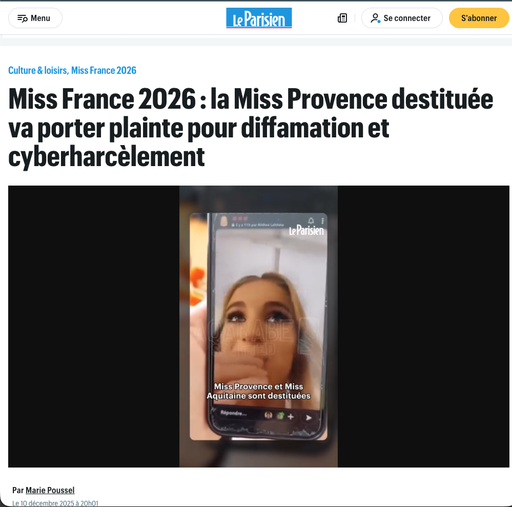 “Miss France 2026 : la Miss Provence destituée va porter plainte pour diffamation et cyberharcèlement”, Le Parisien 10/12/2025