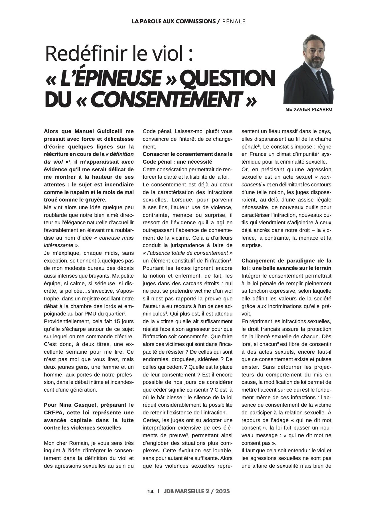 Redéfinir le viol :”l’épineuse” question du “consentement”, journal du Barreau de Marseille, juin 2025